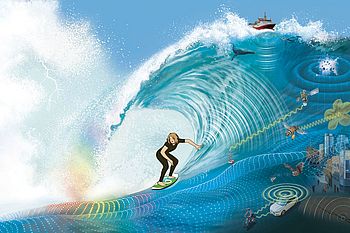 Die Ausstellung lädt ein, die Bedeutung, Schönheit und Kraft von Wellen auf spielerische Weise mit allen Sinnen zu erkunden durch zahlreiche großformatige, farbenfrohe Illustrationen und viele Hands-on-Exponate.