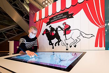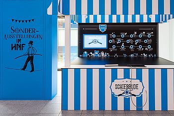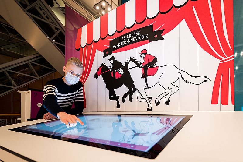 Dabei lassen bekannte Kirmes-Attraktionen und moderne Elemente Ausstellungen, Veranstaltungen und Anekdoten lebendig werden: Mit einem kräftigen Schlag auf "Hau den Lukas" erhalten die Besucher einen Eindruck von den spannendsten Stationen in der Geschichte des HNF. Ein virtuelles Pferderennen verdeutlicht die rasante Entwicklung der Computertechnologie von den Anfängen bis heute. Bei einem witzigen Quiz gilt es, die richtigen Antworten zu kennen oder zu raten. Wer ist als Erster im Ziel?