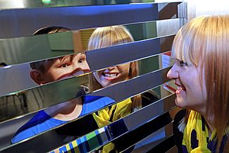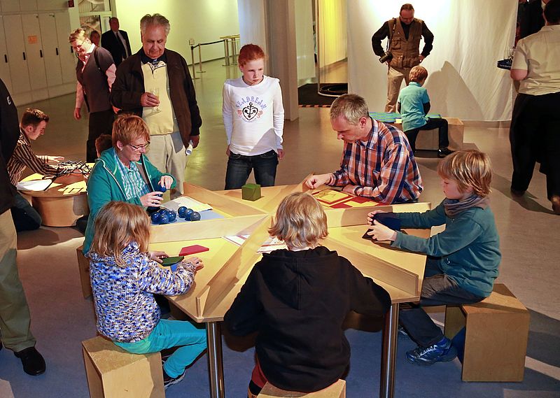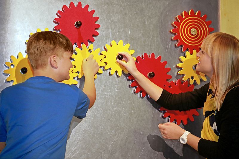 Am Knobeltisch bauen Kinder eine Kugelpyramide zusammen oder ordnen bunt gefärbte Quadrate richtig an. Sie können Formen fühlen oder sich im Spiegelhäuschen unendlich oft von allen Seiten sehen oder erstaunt feststellen, dass der direkte Weg nicht immer der schnellste ist.