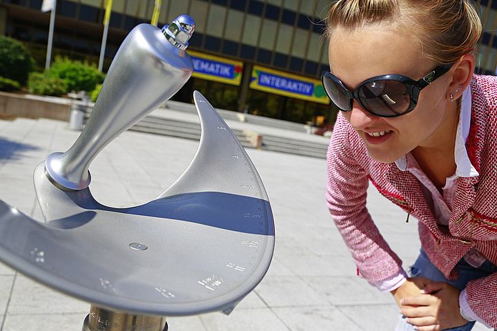 Bereits seit der Antike sind Sonnenuhren bekannt. Über Jahrhunderte galten sie als genaue Zeitmesser, bis sie Ende des 19. Jahrhunderts endgültig von mechanischen Uhren abgelöst wurden und nur noch ein Dasein als schmückender Zierrat abgaben. Doch seit einigen Tagen steht vor dem Heinz Nixdorf MuseumsForum eine Sonnenuhr, die mithilfe modernster Technik gefertigt wurde und die Zeit auf die Minute anzeigt.