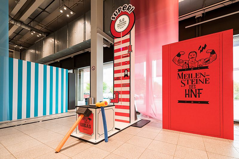 Klassische Kirmesattraktionen sorgen für ebenso viel Spaß wie Information. Mit einem kräftigen Schlag auf "Hau den Lukas" erhält man einen Eindruck von den spannendsten Stationen in der Geschichte des HNF. Ein virtuelles Pferderennen verdeutlicht die rasante Entwicklung der Computertechnologie von den Anfängen bis heute.