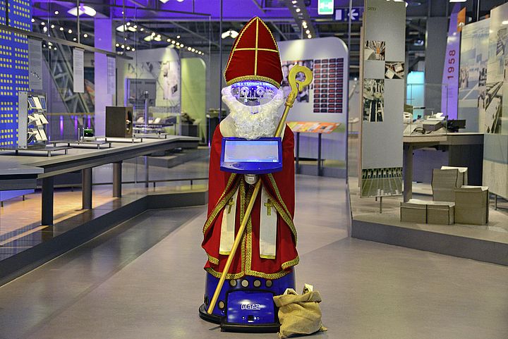 Einen Nikolaus der besonderen Art erleben Kinder ab dem 6. Dezember im Heinz Nixdorf MuseumsForum. Dort trägt die Figur des Heiligen zwar auch Mantel, Bischofsstab und Mitra, rollt aber auf Rädern durch das Museum und spricht mit einer mechanisch klingenden Stimme. Kein Wunder, unter dem Mantel verbirgt sich Roboter PETER, der die Besucher durch die Ausstellung führt.