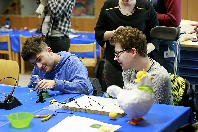 "Wollen wir zusammen Löten?", wird die vierzehnjährige Anna-Lena gefragt. Die Jugendliche sitzt in einem Elektrorollstuhl und braucht ein bisschen Unterstützung bei der fummeligen Lötarbeit. Gemeinsam mit einem Jungen der Heinz-Nixdorf Gesamtschule gelingt die Operation und der kleine Knopf hängt am Kabel. Beim inklusiven Tastenbauen lernen die Schüler neben der Technik auch das erfolgreiche Miteinander.