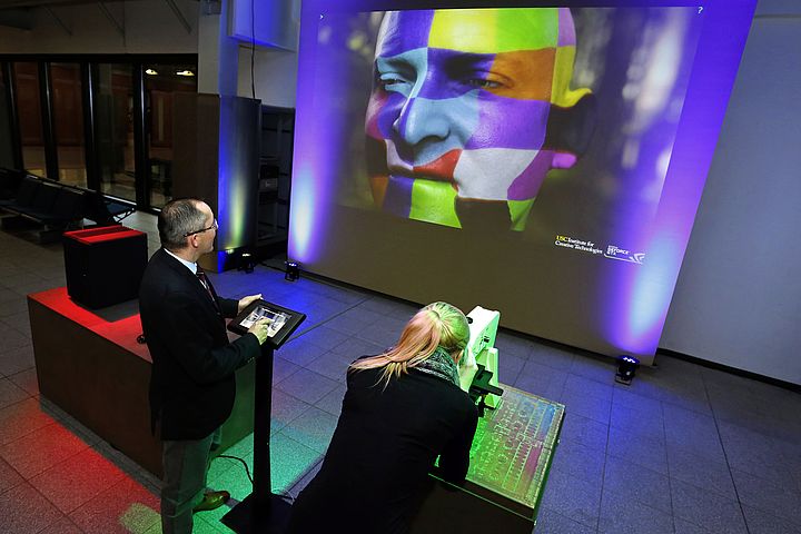 Details des Chips sind auf künstlerischen Detailaufnahmen zu erkennen. Zudem haben die Besucher die Möglichkeit, den Avatar Bruce Facework in einem kurzen Hörspiel persönlich kennenzulernen.