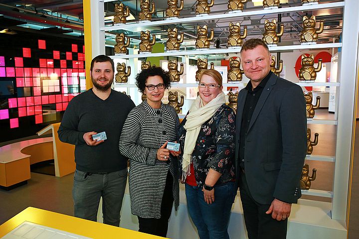 Bildunterschrift: Robert Salzseiler (l.) und Schulleiterin Tanja Heinemann (2.v.l.) von der Gesamtschule Verl freuen sich mit Geschäftsführer Dr. Jochen Viehoff und Frauke Elbracht (HNF) vor den programmierbaren Winkekatzen im HNF über die Kooperation. Foto: Braun Media/HNF