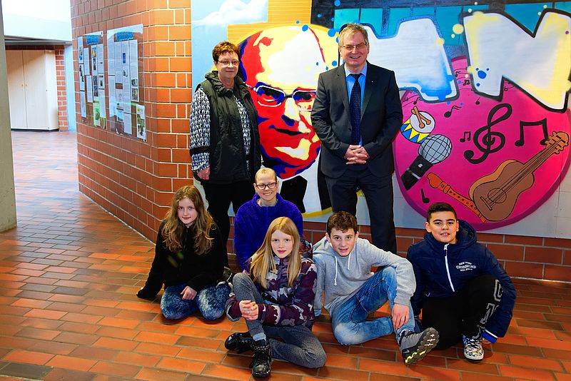 HNF-Geschäftsführer Dr. Kurt Beiersdörfer und Schulleiterin Andrea Reck mit Schülern der Heinz-Nixdorf-Gesamtschule vor dem Graffiti des Namensgebers.