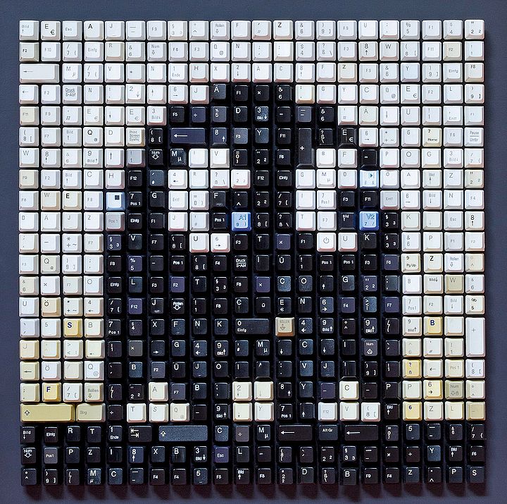 Dass aus alten Computertastaturen wahre Kunstwerke entstehen können, zeigt der Frankfurter Künstler Peter Schönwandt. Arrangiert wie Mosaike entstehen aus den Tasten eindrucksvolle Bilder von Pac-Man bis Konrad Zuse.
