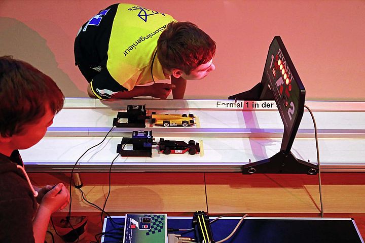 Durchdrehende Reifen, Hektik in der Boxengasse und rasantes Tempo bestimmen nicht nur den Alltag von Sebastian Vettel und Co., sondern sind auch die Kennzeichen beim Wettbewerb Formel 1 in der Schule. Wie im realen Rennsport geht es um Tempo und Sieg. Doch die Teilnehmer sind zwischen 11 und 19 Jahren alt und haben ihre Rennwagen selbst gebaut. Angetrieben werden die Modellautos mit einer Gaskartusche, die sie bis auf 120 km/h beschleunigt.
