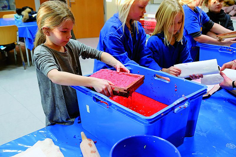 Papier kam früher nicht aus industrieller Produktion, sondern wurde Bogen für Bogen per Hand geschöpft. Diese traditionelle Technik probieren Kinder von sieben bis zwölf Jahren am
