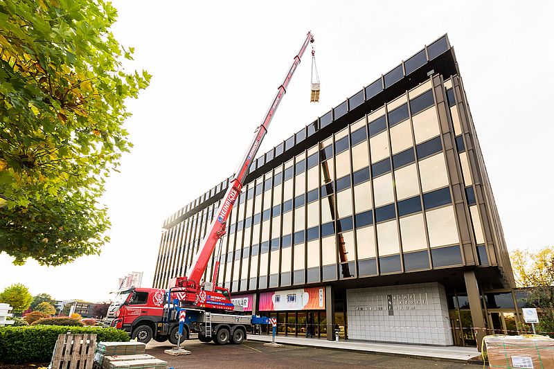 Sechs Stunden benötige der Autokran am Montag, um 550 Photovoltaik-Module auf das Dach des Heinz Nixdorf MuseumsForums zu heben. Wenn die Anlage installiert ist und die Sonne scheint, liefert sie bis zu 223 Kilowatt elektrische Leistung und steuert damit einen erheblichen Anteil am Stromverbrauch des Museums bei.