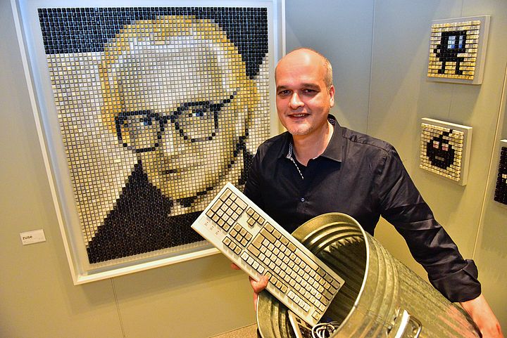 Peter Schönwandt verwendet für seine Kunstwerke ausrangierte Tastaturen. Aus teilweise über 3.000 einzelnen Tasten fertigt er einzigartige Mosaike, die die Betrachter durch ihre Dreidimensionalität genauso beeindrucken wie durch ihre pixelige Struktur. Seine Werke spiegeln unsere digitale Welt wider, greifen aber auch das Thema des Recycling auf und sind daher eine ideale Ergänzung zur anderen aktuellen Sonderausstellung im HNF "KonsumKompass".