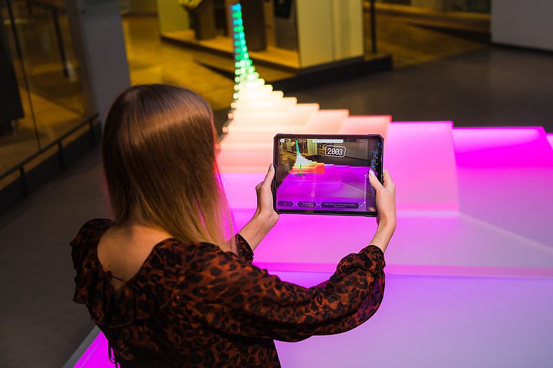 Mithilfe der AR-Anwendung können Besucher im HNF nun diese Entwicklung nachvollziehen. Sie halten einen Tablet-Computer auf die farbige Installation und bekommen damit nicht nur zusätzliche Informationen eingeblendet, sondern auch virtuelle Gegenstände. So sehen sie, welche Chips in welchen Jahren eingesetzt wurden und welche Geräte damals brandaktuell waren. Ein C64 und ein Game Boy sind zum Greifen nah. Besonders spektakulär wird es, wenn ein virtuelles Elektroauto in das Museum fährt und die Tür zum Einsteigen öffnet. Da kommt so mancher Besucher ins Grübeln, was Fakt und Fiktion ist.