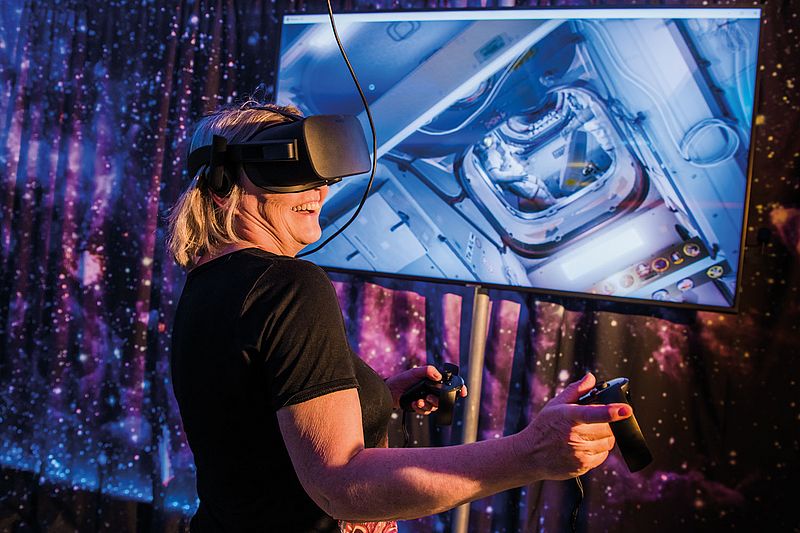 Mit der anderen Brille schweben die virtuell Reisenden durch die Internationale Raumstation. Auf den Spuren von Alexander Gerst bewegen sie sich durch die ISS, erkunden die einzelnen Module und können so ermessen, wie groß dieser Außenposten der Menschheit im All tatsächlich ist.