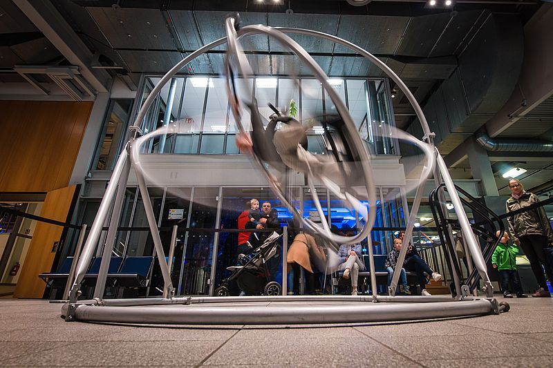 Besonderer Andrang herrschte im 3. Obergeschoss, wo die Sonderausstellung zur Raumfahrt die Besucher anlockte. Aber auch im Erdgeschoss herrschte Weltraumfieber. Ob beim Basteln von Raketen, beim Astronautentraining oder einem virtuellen Flug zum Mond, überall drängten sich die Menschen.