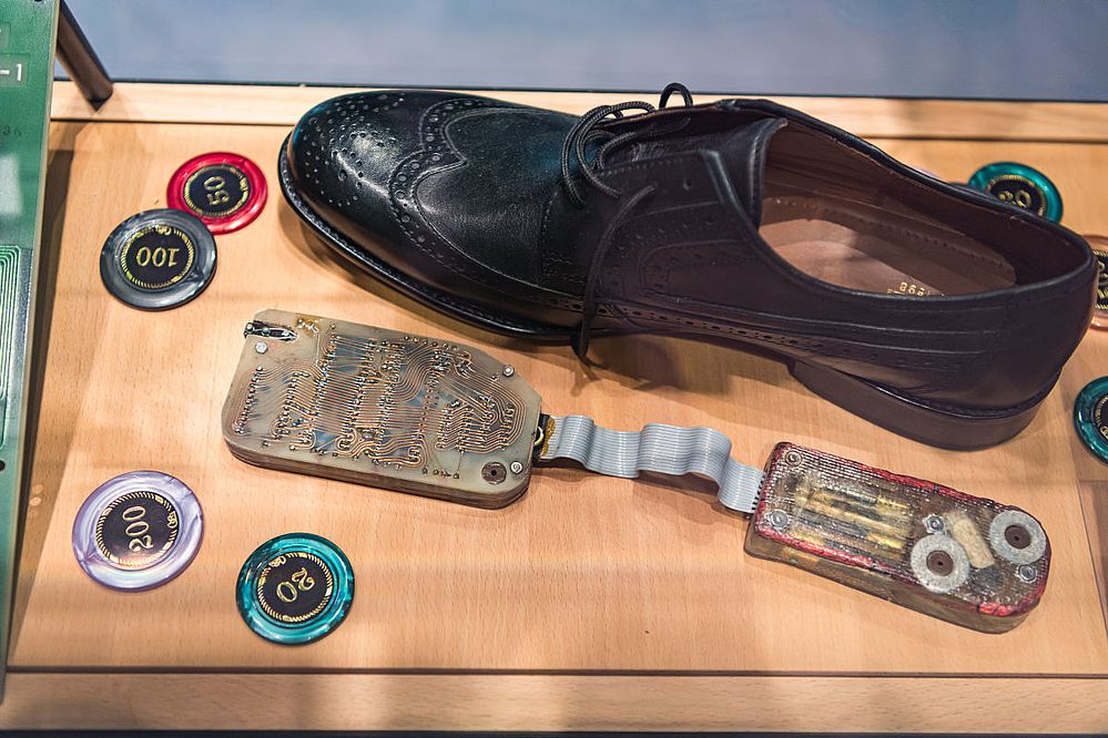 Der erste Computer, auf dem man gehen konnte, ist im Heinz Nixdorf MuseumsForum zu sehen. Seinen Einsatz hatte der Schuhcomputer Anfang der 1980er-Jahre in einem Spielkasino in Las Vegas, als mehrere Freaks aus Kalifornien damit versuchten, den großen Gewinn zu landen.