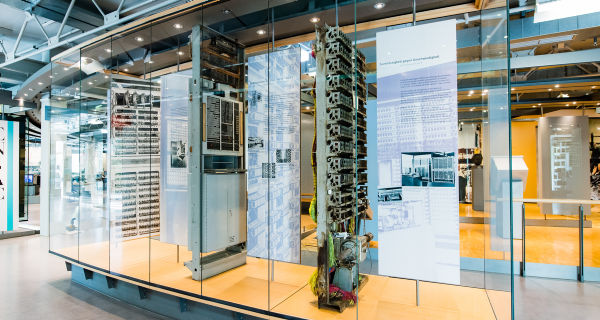 Der Ausstellungsbereich "Die ersten Computer - Ideen, Konzepte, Maschinen" besteht aus einer Großvitrine mit Originalteilen der Relaisrechner "Harvard Mark I" und "Model V" sowie einer multimedialen Installation zur Computergeschichte von 1935 bis 1955.