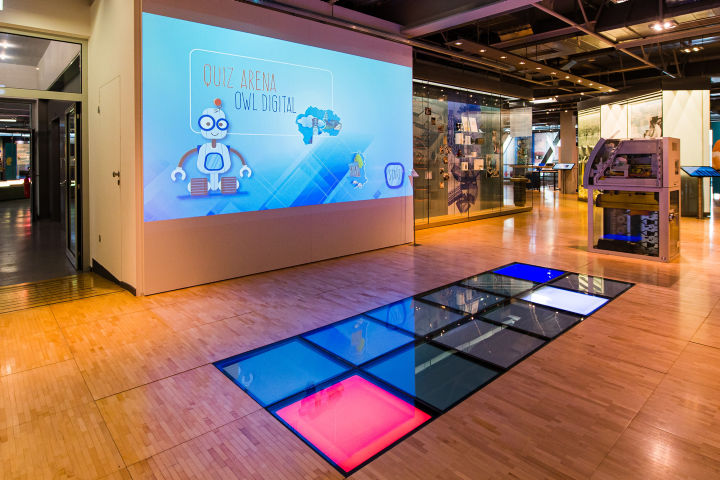 Word has finally gotten out that the Eastern Westphalia-Lippe (OWL) region is a high-tech hub. This is also the focal point of the Quizarena. Both bright minds and fast feet are required here. Just like the legendary German quiz show “1, 2 or 3”, players must demonstrate their knowledge by hopping on coloured tiles in the floor. The content focuses on avatars in Bielefeld, robots in Paderborn and the blazing Hermann in Detmold. But the main point of it all is simply to have fun.