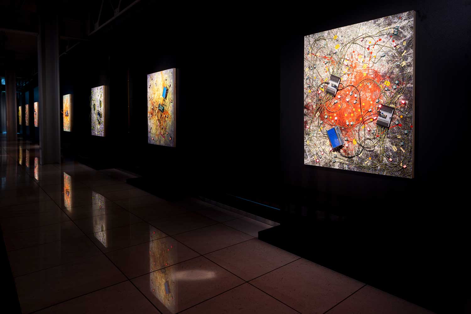 Het kunstwerk biedt een blik vanuit vogelperspectief op een cybernetisch stedelijk landschap, waarin wolkenkrabbers van silicium en printplaten zijn gebouwd.