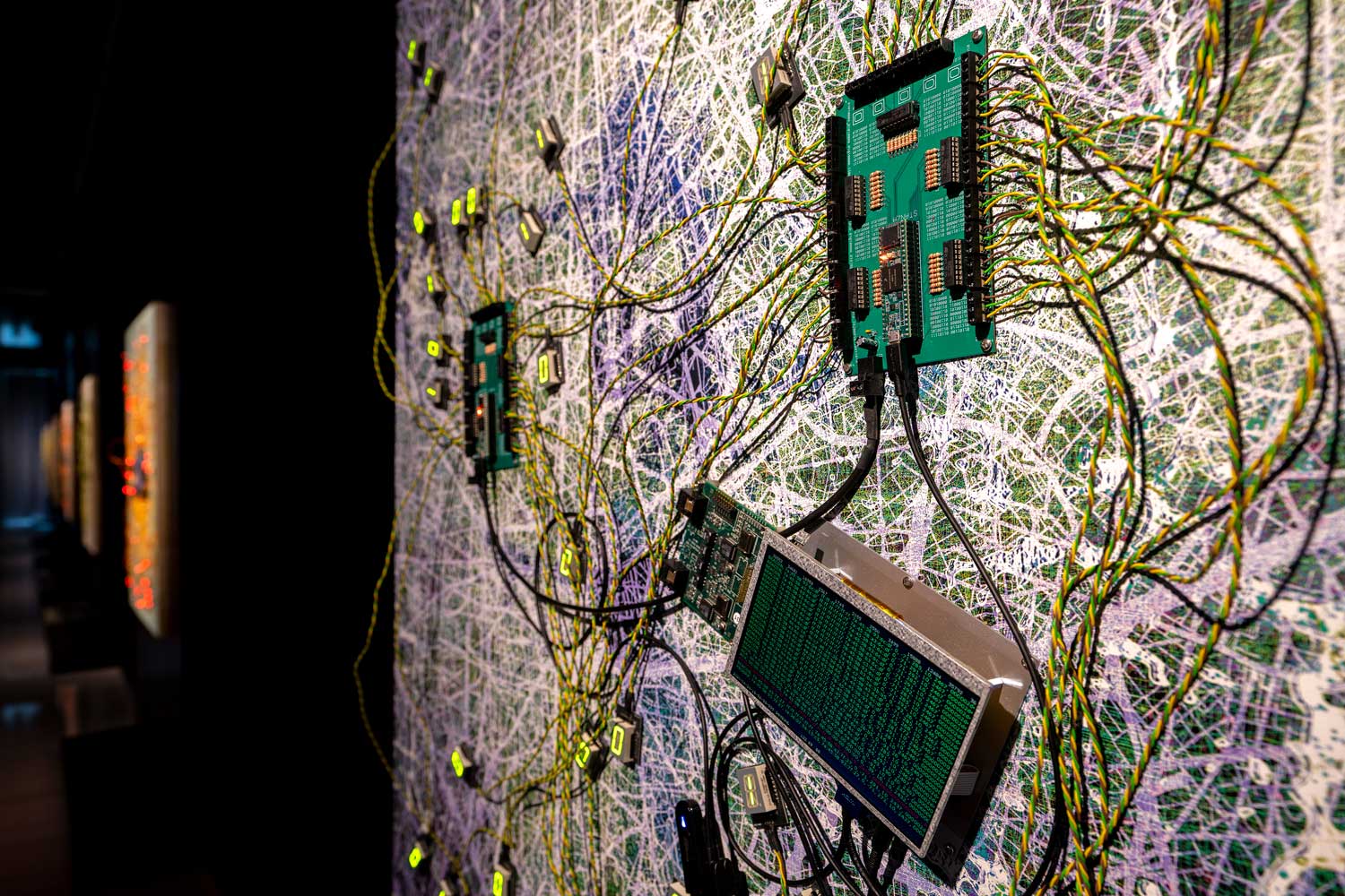 The Nemesis Machine is op het eerste gezicht een fascinerend, flikkerend, uniek kunstwerk vol elektronica, monitoren, licht en verbindingen. Maar wie de installatie van de Londense kunstenaar Stanza iets langer op zich laat inwerken, ontdekt het diepere karakter.
