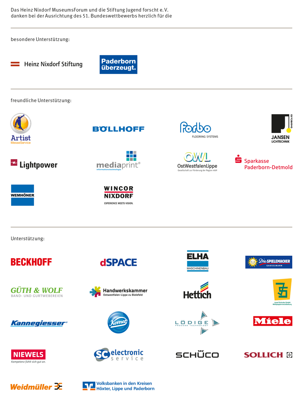 Die Patenschaft für Jugend forscht hat an der Paderborner Fürstenallee bereits Tradition: 1973 und 1978 war die Nixdorf Computer AG Gastgeber der Veranstaltung, im Jahr 2000 war das HNF erstmals Bundespate. Die Durchführung des Bundeswettbewerbs ist nur durch die Unterstützung von zahlreichen Unternehmen und Institutionen Ostwestfalen-Lippes möglich. Die Stiftung Jugend forscht e. V., die Heinz Nixdorf Stiftung und der Verein "Paderborn überzeugt" engagieren sich besonders stark.